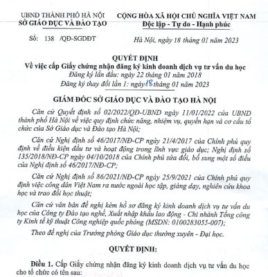(Tiếng Việt) Giấy phép hoạt động du học của Mangaet